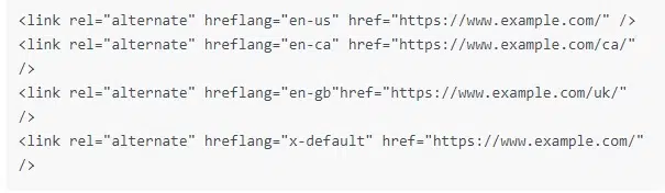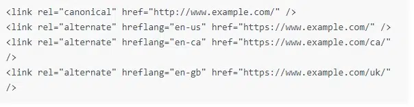La meilleure façon d’expliquer les meilleures pratiques pour l’attribut hreflang est d’utiliser l’exemple mentionné ci-dessus avec le site Web anglais ciblant les utilisateurs aux États-Unis, au Canada et au Royaume-Uni. C’est la définition complète de l’attribut hreflang pour cet exemple :