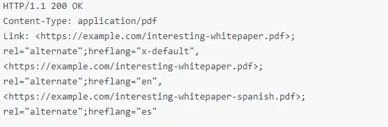 De la même manière que les liens canoniques et les directives des robots qui peuvent être définies via l’en-tête HTTP, cela peut également être fait pour l’attribut hreflang. Le cas d’utilisation le plus courant consiste à définir le ciblage d’audience pour les documents non HTML, tels que les fichiers PDF par exemple. Les fichiers PDF sont également explorés et indexés, et si vous les avez en plusieurs langues, il est logique de définir leur public cible. Voici un exemple de la partie de l’en-tête HTTP qui ressemble à l’attribut thehreflang :