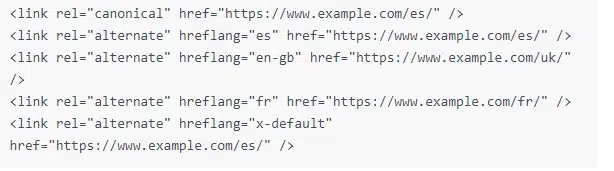 Habituellement, la façon la plus simple d’implémenter l’attribut hreflang est de l’inclure dans la section <head> de vos pages HTML. Lorsque vous définissez l’attribut hreflang, vous décrivez non seulement le ciblage d’audience pour la page en cours, mais également les variantes localisées de la page. Par exemple, supposons qu’une page d’accueil en espagnol soit également disponible en anglais et en français, et que vous souhaitiez que la version par défaut soit la page d’accueil en espagnol, la définition complète serait présente sur toutes les variantes de la page d’accueil en espagnol :
