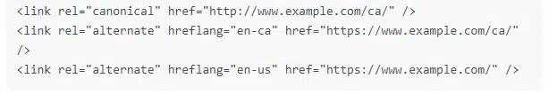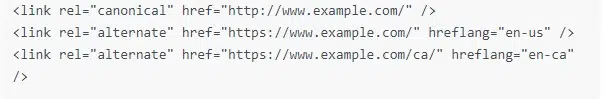 Dans cet exemple, la page canadienne (https://www.example.com/ca/) est la variante alternative de la page en cours. Sur cette page, la définition ressemblerait à ceci :