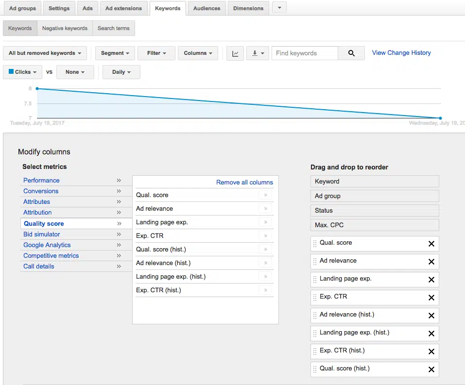 Semblable à l’hypothèse selon laquelle les extensions d’annonces affectent les quality score, l’ajout ou la suppression de mots clés à exclure n’a aucun impact direct sur le quality score. L’ajout de mots clés à exclure peut vous aider à améliorer vos taux de clics, puis à améliorer indirectement votre quality score.