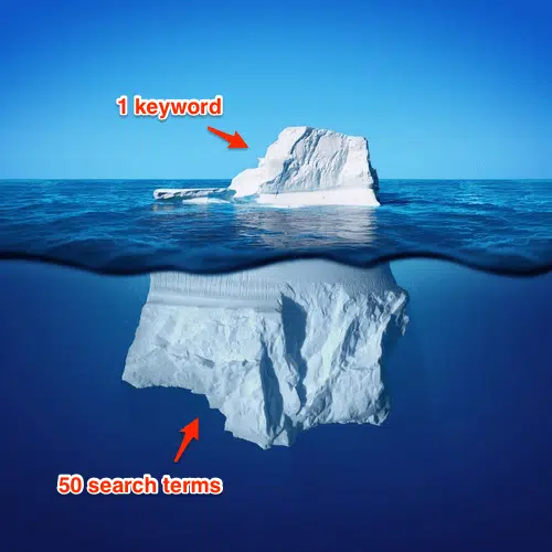 En fonction des types de correspondance de mots clés que vous utilisez (principalement l’expression, le modificateur de requête large et le contenu large), vous constatez que vos enchères (mot clé en surface) sont loin d’être réellement payantes (termes de recherche en dessous de la surface). Étant donné que l’écart varie en fonction de certains mots clés et de certains types de correspondance, il est important de noter que vos taux de clics risquent de dépasser cet effet d’iceberg. Une fois que vous aurez resserré le ratio, vous constaterez plus souvent que vos taux de clics s’amélioreront également.