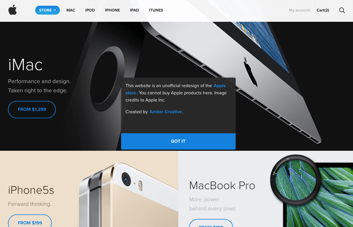 Ce conseil est particulièrement utile pour une activité de freelances en design. Si vous êtes web designer, pourquoi ne pas redesigner un site internet populaire et expliquer pourquoi vous avez fait les changements que vous avez fait ? Voici l’exemple de Amber Creative, qui a créé une version alternative du site d’Apple Store :