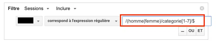 Cas concret : vous souhaitez créer un segment avancé dans Google Analytics qui contienne les visiteurs qui ont visité au moins une fois une page catégorie (vous avez en tout 14 pages catégories, 7 pour le menu femmes et 7 pour le menu hommes). Voici le type d’expression régulière que vous pouvez utiliser : /(homme|femme)/categorie[1-7]/$