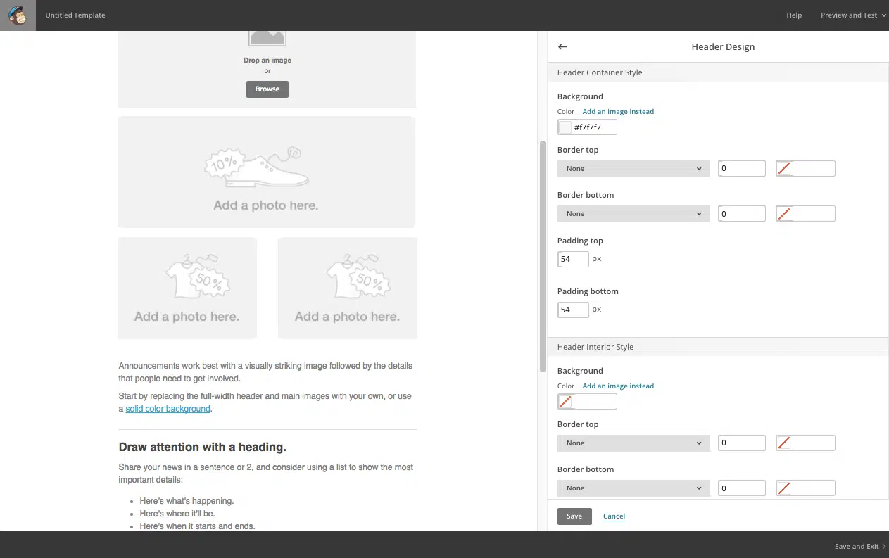 Vous pouvez aussi personnaliser l’arrière-plan en y intégrant un visuel. Impossible de lister toutes les possibilités de personnalisation, elles sont très nombreuses. En clair, MailChimp permet de personnaliser tous les éléments de contenu et de design de votre template. Ajoutons tout de même qu’il est possible de personnaliser l’affichage du template sur mobile, pour que votre template soit mobile-friendly. Vous avez par exemple la possibilité de choisir un taille de police plus petite pour l’affichage sur mobile. A noter que vous devez obligatoirement afficher le logo MailChimp en bas du template si vous bénéficiez de l’offre gratuite. Vous pouvez à tout moment voir à quoi ressemble votre template (sur desktop et mobile) en cliquant sur Preview and Test en haut à droite de l’écran.