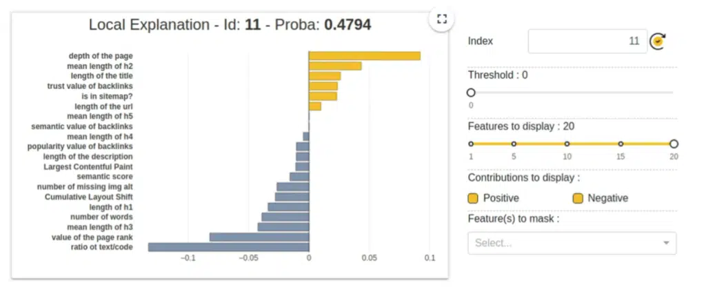 De nombreuses règles sont à mettre en place, mais il est difficile de savoir lesquelles vont réellement avoir un impact sur le trafic. ULI analyse l’ensemble d’un site et ses concurrents afin de déterminer quelles recommandations vont avoir le plus d’impact, et qui devraient donc être considérées comme des priorités. Sur cette capture d’écran, on observe notamment les fonctionnalités pénalisantes pour une page.