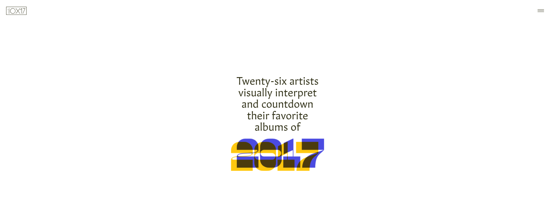 Derrière le site 10×17 se cachent 26 artistes qui partagent leurs morceaux préférés de l’année 2017 et les illustrent à leur manière avec un code couleur similaire. Le site prend la forme d’un compte à rebours, du jour 10 au jour 1. Pour chaque jour, 26 morceaux, 26 magnifiques illustrations, et un petit lecteur à côté pour jouer chaque morceau.