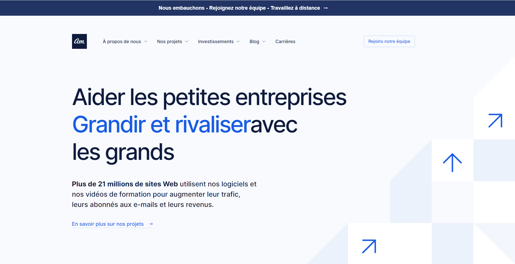 Awesome Motive est une entreprise qui aide au développement du business en ligne. La proposition est formulée en front page avec une phrase résumée et représentée en animation 3D sous la forme d’un petit commerce qui grossit grâce à des outils : WordPress, emails, analyses de données, etc. Quand on déroule, le site communique sur les partenariats réalisés.