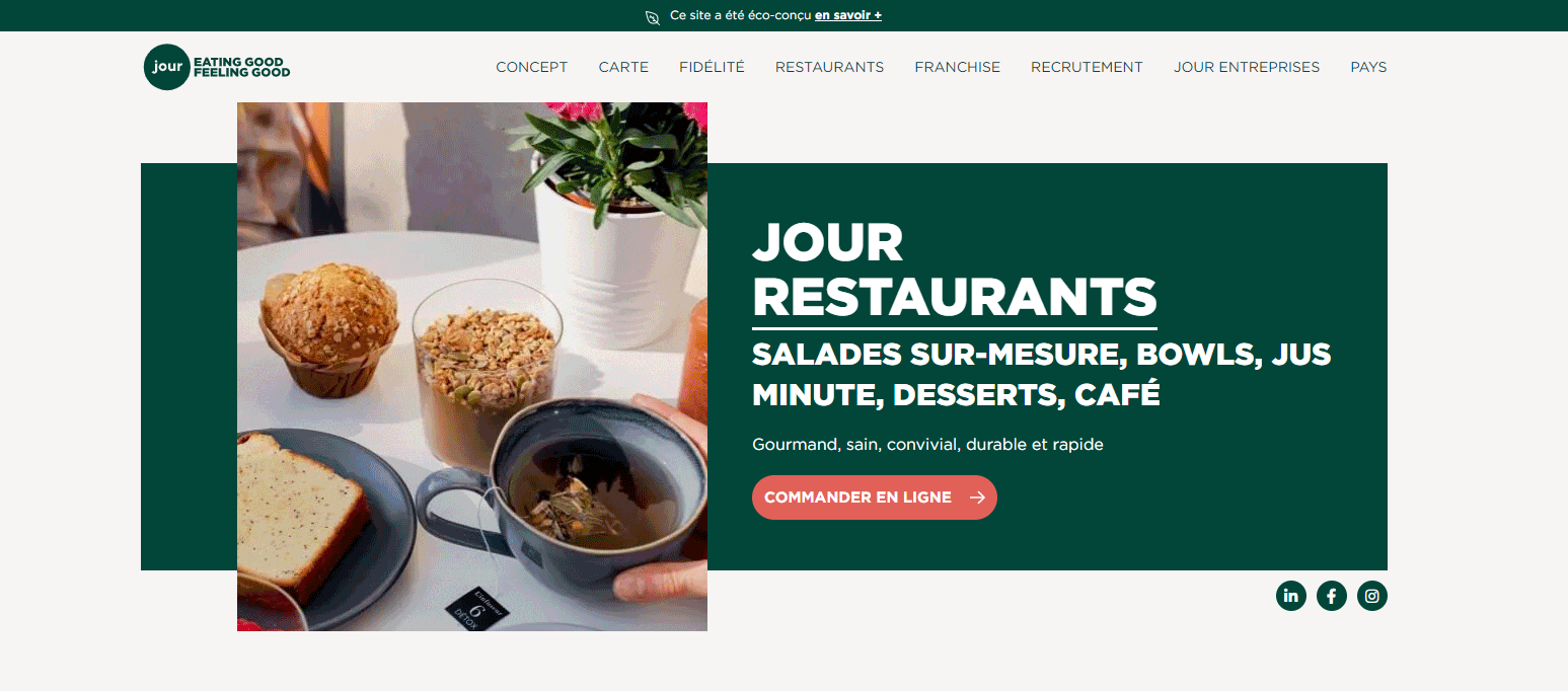 Jour se présente comme une chaîne de restauration saine. La promesse est faite avec un thème à dominante verte, et le panneau d’accueil vise la simplicité avec un déroulement horizontal de trois grandes images. Le menu du haut offre un repère immédiat quel que soit ce que vous cherchez : restaurants, jobs, franchise, etc.