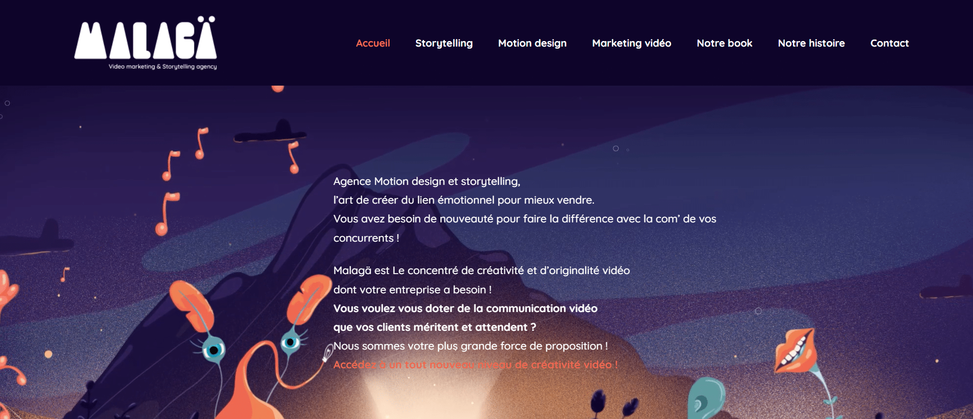 On a adoré le Header animé de ce site web. Comme quoi, une belle animation peut faire toute la différence ! Malaga est une entreprise Niçoise, spécialisée dans la conception de vidéo Marketing et de storytelling vidéo. Ils utilisent leurs talents pour enrichir leur site web et le rendre unique.