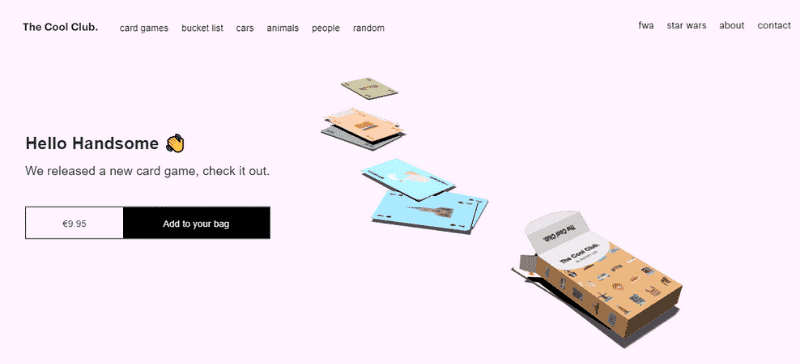 The Cool Club est une entreprise de e-commerce vendant des objets tels que des cartes à jouer ou des affiches dessinées. Le site a été créé sur fond blanc, et met en avant un paquet de cartes à jouer, animées en 3D. Cette animation 3D donne une impression soignée et très moderne. Plus bas, les bandeaux se succèdent et regroupent différents types d’affiches : celles qui représentent des animaux, des gens célèbres, etc.