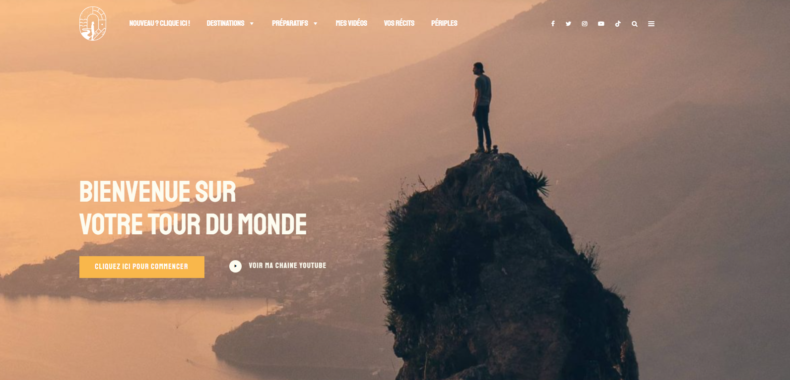 Le vidéaste vedette Bruno Maltor, entrepreneur à succès dans le domaine du voyage, a choisi un site au design épuré, « Votre tour du Monde ». Une vidéo incrustée en haut de page, des grandes photos, du texte parcimonieux, avec les idées importantes en surbrillance donnent un rendu immersif. Les sujets essentiels sont abordés en front page, mais on a l’impression d’une grande organisation grâce au classement par formats : itinéraires, tops 5, récits, etc.