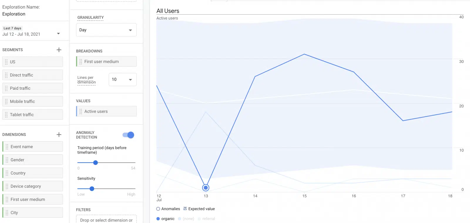 Une fois de plus, Google renforce ses capacités d’apprentissage automatique et d’intelligence artificielle. Désormais, vous verrez la détection des anomalies sur la plupart des graphiques linéaires dans GA4.