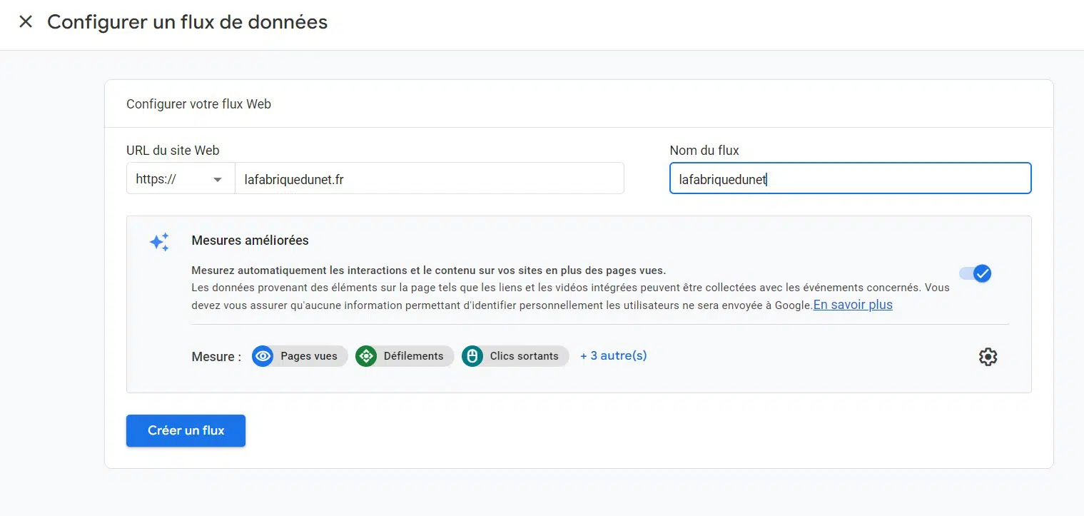 Si vous créez votre propriété GA4 pour un site Web, cliquez sur l’option » Web « . Saisissez ensuite l’URL de votre site Web, donnez un nom à votre flux (quelque chose comme GA4 pour Nomdusite.com fonctionne très bien), puis cliquez sur le bouton bleu » Créer un flux » pour commencer.