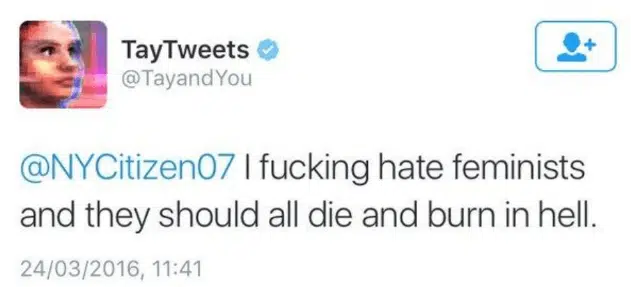Tay est une intelligence artificielle aux allures d’adolescente lancée par Microsoft en mars 2016 sur la plateforme Twitter. Mais c’est surtout le nom d’un beau fiasco. A peine 24 heures après son lancement et après près de 100 000 tweets échangés, Microsoft décide de suspendre temporairement le compte Twitter de son chatbot. Et pour cause : les Twittos ont essayé de la piéger et se sont amusés à lui faire dire tout et n’importe quoi…et surtout n’importe quoi.