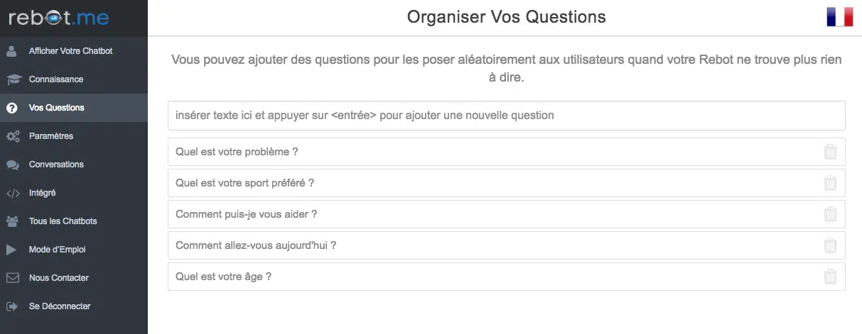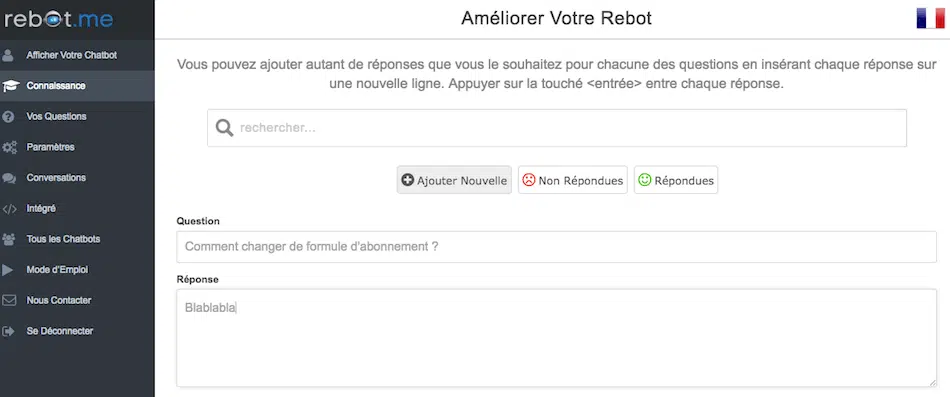 Rebot.me est l’un des seuls outils de création de bots disponibles en version française. Ce qui plaira aux personnes mal à l’aise dans la langue de Shakespeare. Rebot.me est aussi gratuit, ce qui est un autre de ses avantages. Son principe d’utilisation est simple. Lorsque vous créez votre bot sur Rebot.me, vous êtes invité à définir un ensemble de questions / réponses. Vous pouvez ajouter autant de questions que vous le souhaitez et définir plusieurs réponses pour chaque question. A chaque fois qu’un utilisateur posera une des questions prédéfinies par vous, votre bot répondra une des réponses de manière aléatoire. Vous pouvez aussi configurer des questions de relance de conversation qui se déclencheront de manière aléatoire lorsque votre chatbot sera confronté à une requête inconnue.