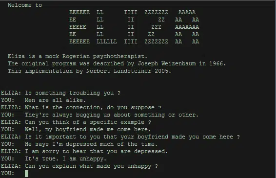 Eliza est l’ancêtre des chatbots. Le programme a été conçu entre 1964 et 1966 par le laboratoire d’intelligence artificielle du célèbre MIT de Boston. Eliza est une psycho-thérapeute de l’école rogérienne. Mais une psycho-thérapeute d’un genre particulier : elle se contente de relancer son interlocuteur, contrairement aux chatbots contemporains qui apportent des réponses utiles prélevées à partir de leur base de connaissances. Eliza écoute plus qu’elle ne dialogue. Le niveau des échanges est donc assez limité.