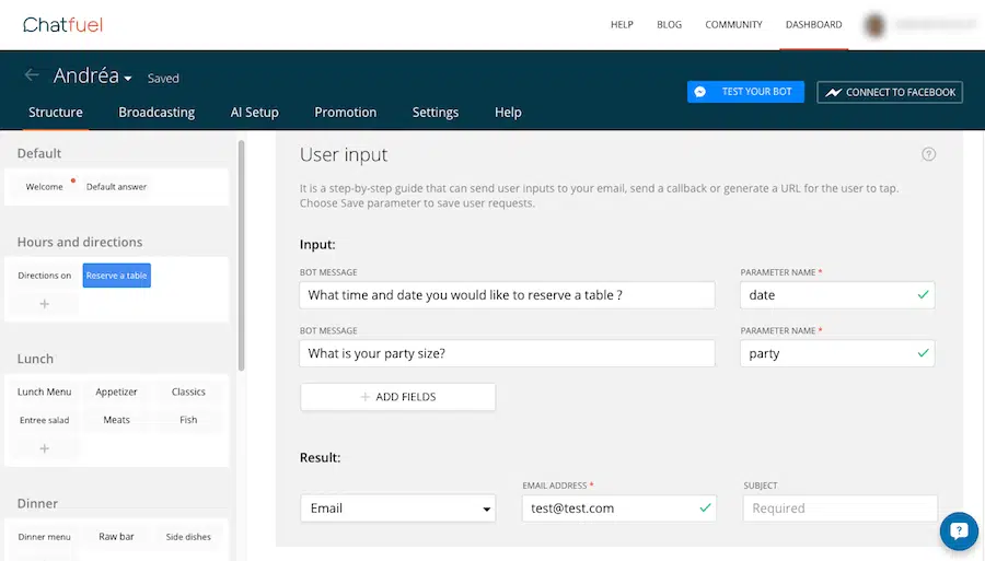 L’un des points forts de Chatfuel, c’est que vous pouvez associer des mots à des blocs / boutons. Si par exemple un utilisateur utilise le mot « table » ou « réserver » dans son message, le chatbot renverra vers le bloc de réservation de table. Pas besoin que la requête matche complètement avec une requête prédéfinie pour que votre chatbot soit en mesure de proposer une réponse. Cette fonctionnalité de reconnaissance de mots, particulièrement utile, est absente de Rebot.me.