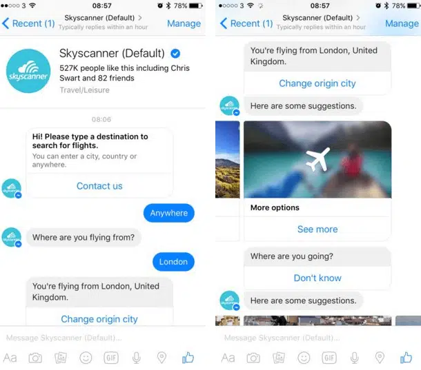 Skyscanner a pris toute la mesure du développement des chatbots et est persuadé que cette nouvelle technologie s’imposera dans les années à venir dans le secteur du voyage. Le comparateur écossais est d’ailleurs le premier à avoir conçu une fonction de recherche vocale pour Alexa, le système de reconnaissance vocale d’Amazon. Dans le même secteur, Voyage-Sncf et KLM ont eux aussi franchi le pas et conçu leur chatbot Facebook Messenger.