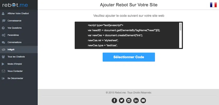 Vous pouvez intégrer vos bots sur votre site internet via un code d’intégration :