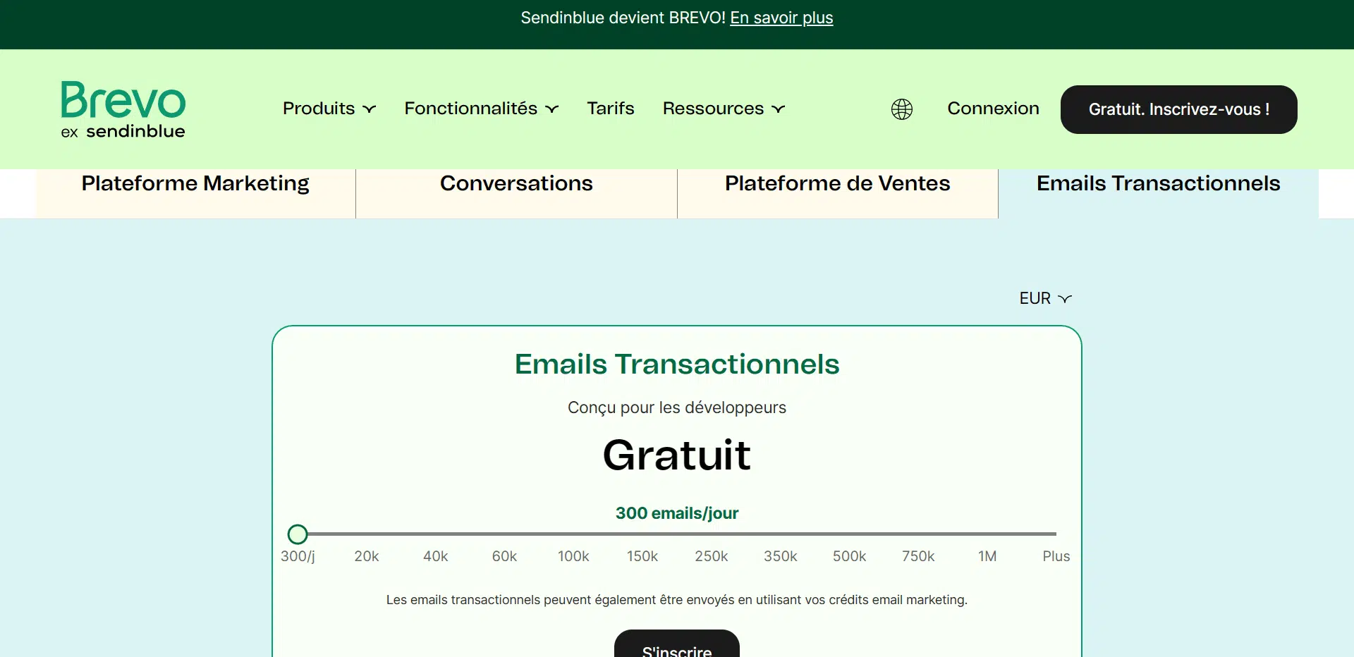 Le coût des emails transactionnels de Brevo varie en fonction de la quantité d’emails que vous souhaitez envoyer. Vous avez la possibilité d’envoyer gratuitement jusqu’à 300 emails par jour, au-delà desquels les tarifs des emails transactionnels de Brevo débutent à partir de 10 €/mois pour 20 000 emails, et vont jusqu’à 1 000 000 d’emails pour 460 € par mois. Vous pouvez même dépasser ce seuil de nombre d’envois quotidiens, en demandant une offre personnalisée auprès de Brevo qui vous communiqueront votre tarif individuel.